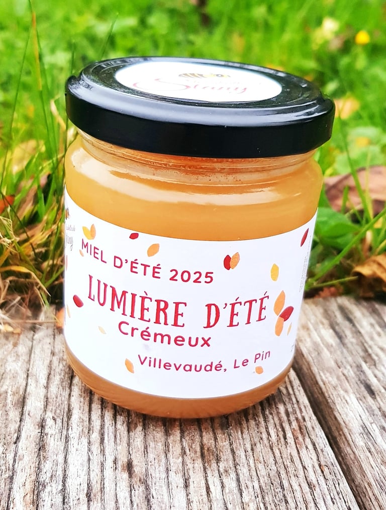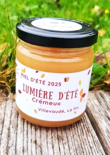 Principalement issu du tilleul et de la ronce, enrichi par d’autres fleurs sauvages de Villevaudé et du Pin, il révèle un goût fruité, généreux et légèrement mentholé, typique des miels d’été.